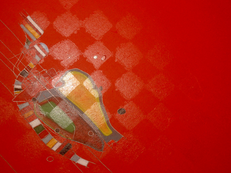 Boho butchers apron Medium: Acrylic, gloss varnish/ glaze, lead render in handmade solid oak box frame. Size: 700x700mm Date:2006 Price upon request.