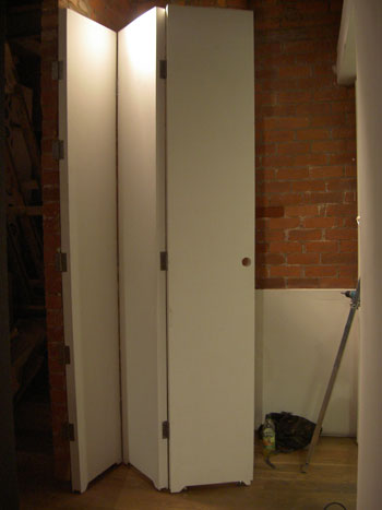 Concertina doors Design build & installation of space saving solution for white wall gallery Cube Mcr. Pine framework/ MDF clad. 2010.