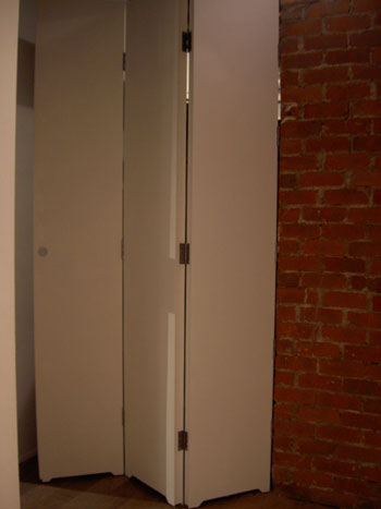 Concertina doors Design build & installation of space saving solution for white wall gallery Cube Mcr. Pine framework/ MDF clad. 2010.