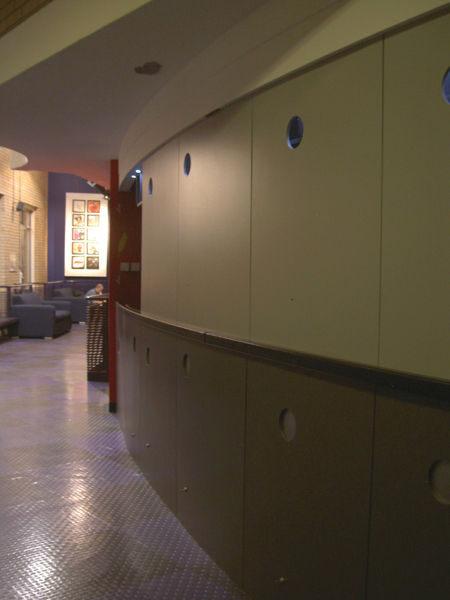 Design & build of interval bar for Contact Theatres upper foyer- (SPACE2). Independently sliding/ removable & lockable panelling. Formed mdf with acrylic finish. 2007.
