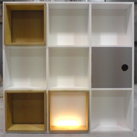 Storage Solutions Storage solutions for private domestic client 2008. Design & build of interchangable storage with light box details. MDF, white acrylic spray finish, birch ply, laminates and perspex.